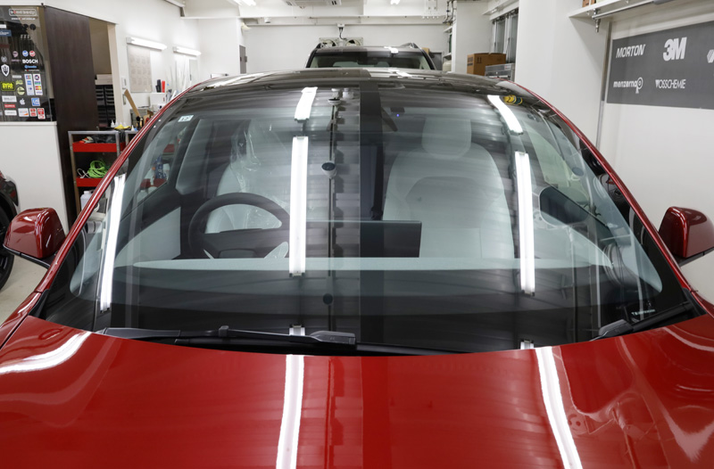 テスラ モデル3は、フロントガラス、パノラマルーフ、リアガラスと面積が大きいガラスのため車内への熱吸収が多く、夏場には車内温度が上がり暑さを大変感じやすくなるため、断熱フィルムの施行をお勧めなお車です。